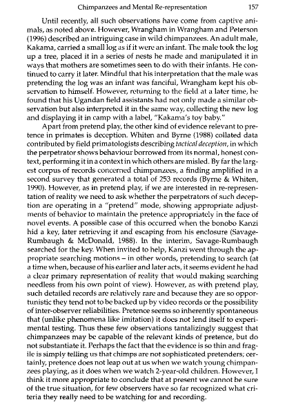 Je ne suis pas très impressionné parce que ce qui est distinctif du pretense c'est de pouvoir se comporter de façon cohérente par rapport à un truc qui n'est pas là. Par exemple, si je bois du pretend tea dans ma pretend cup et que je renverse le pretend tea, je vais pretend nettoyer le pretend mess etc. Par contraste, ici, on a un bonobo enculturé qui réussit à pointer du doigt le verre où a été versé du pretend juice 68% du temps sur 50 trials... Il y a tellement de trucs confondants que Kanzi pourrait suivre. Si Kanzi "croyait" que l'expérimentateur pointait en fait du doigt le verre où il verse du pretend juice au lieu de comprendre qu'il y verse du pretend juice, on verrait les mêmes résultats... Le fait que le papier ait été publié dans Science en dit plus sur la street cred de Krupenye en primatologie que sur la révolutionnarité des résultats à mon humble avis--mais je devrais peut-être relire plus attentivement le papier? En attendant, je suis plus impressionné par des données plus anciennes mais plus sophistiquées, par exemple celles rapportées dans Whiten 2000