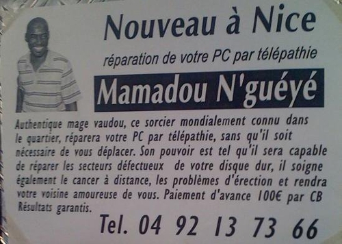 Non Posté 24 mai 2011 Signaler Posté 24 mai 2011 Est-ce que ce "sorcier mondialement connu dans le quartier" (sic) est aussi capable de réparer des ipad ? Le pire est qu'il existe probablement des gens assez naïfs pour croire à une annonce de ce genre…